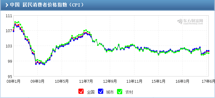 从下图可以看到,国内CPI指数自2011年开始下滑,近年来走势稳定,进入2017年又有小幅下滑。这在一定程度上会限制消费类黄金的需求。
