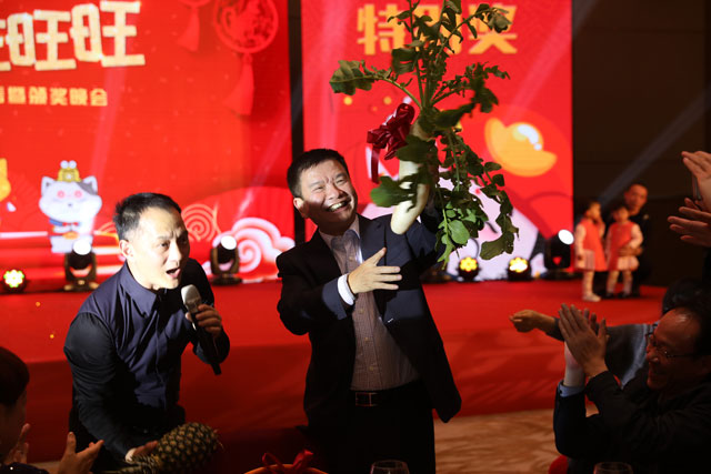 本场晚会大的亮点是“特殊奖”颁奖环节,由恒兴集团孔宇峰董事、副总裁亲自主持,感谢柯董这一年来辛勤工作、睿智决策,带领恒兴集团一步一步走向辉煌。孔总在现场为柯董送上“菜头”和“菠萝”,寓意恒兴集团及柯董一家新年好彩头和好运旺旺来。随后,柯董抽取幸运大抽奖的奖项——5800现金大奖花落投资部的庄巧玲的手中。柯太又乘兴抽出总额达十万港币的奖项,将晚会推上了一波新高潮。本晚会的中奖率达80%,几乎人人有奖,各个喜笑颜开。