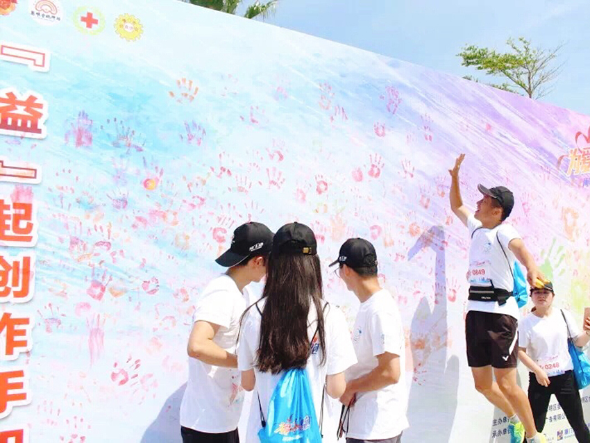 以手为笔,将印有不同颜色的各自掌印,纷纷留在手印墙上,每一个起跳的身影,每一张独一无二代表着爱心的手印,都被一一定格、记录,成为赛场上独一无二斑斓“色彩”。