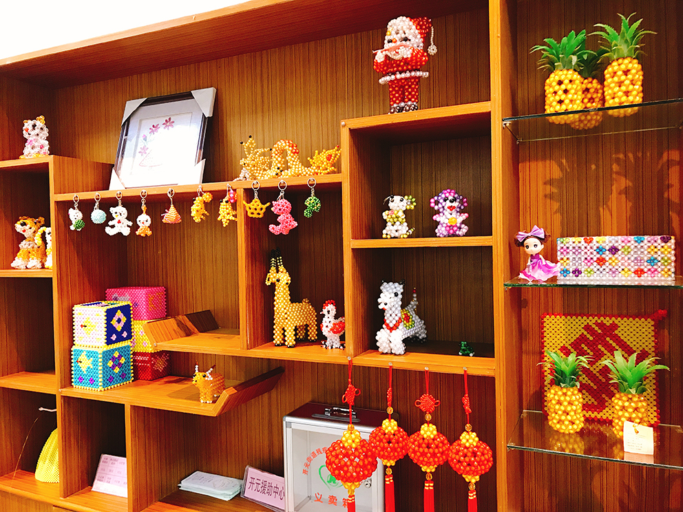 援助中心的橱柜里,摆满了学员们的作品,可爱的小鸡、机灵的小狗、灵巧的钥匙圈…每一个都充盈着学员们的用心、耐心和爱心。恒兴集团志愿者们纷纷掏钱购买这些手工艺品,希望能够以绵薄之力鼓励他们坚持学习,努力创造,实现美好的心愿。
