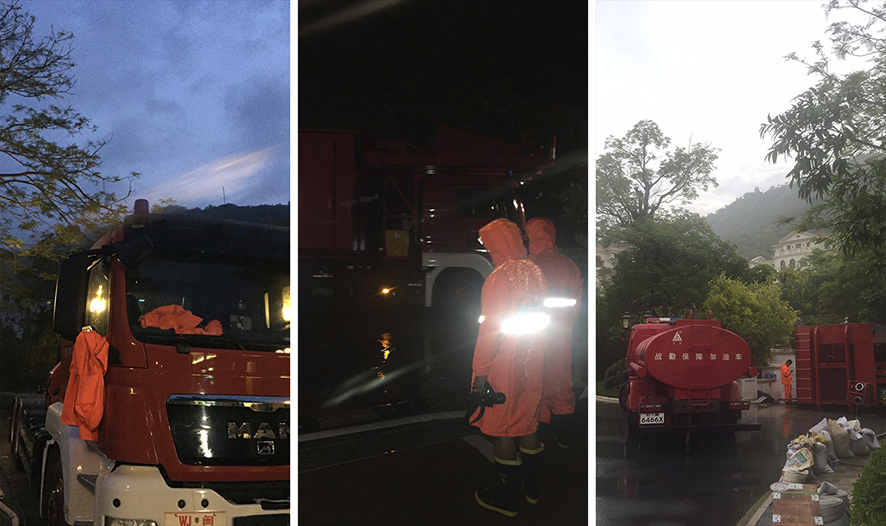 这超百年一遇的强降雨,给云顶庄园造成了严重积水等问题。为将灾害影响降到较低,资产管理部第一时间拨打119消防救助,接到电话,前埔消防中队和翔安新店消防中队的官兵先后赶赴现场,并派出“龙吸水”(大功率排水车)大型排涝车,对云顶庄园的水患地区进行抽水强排;集团资产管理部也迅速组织处置险情,打开水库泄洪口,加大雨水口排水量;灾情过后,资产管理部及时调派组织人手、物资,及时、有序、高效的恢复庄园环境。