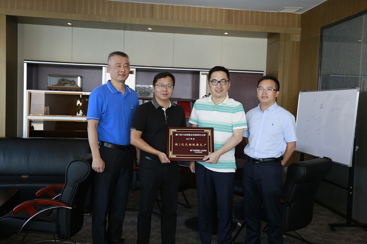 近日,中共思明区委、思明区人民政府授予了厦门恒兴滨海置业有限责任公司“2017年度超1亿元纳税特大户”称号。7月24日,思明区滨海街道副主任钟振荣和书记苏永昌来到财富中心42楼,将纳税大户牌匾和红头文件送到了恒兴集团总裁王伟文的手中。