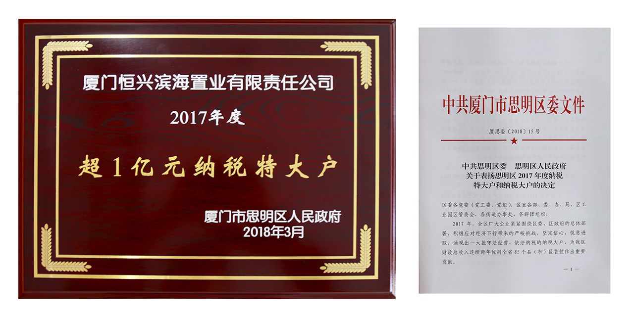 热烈祝贺厦门恒兴滨海置业荣获思明区2017年度超1亿元纳税特大户