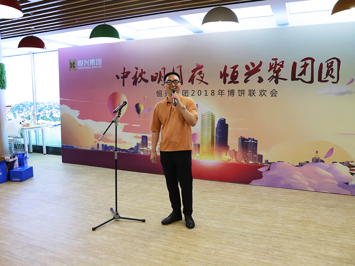 博饼联欢会开始,由恒兴集团王伟文总裁致辞,他代表集团公司管理团队欢迎大家的到来,感谢全体恒兴人的努力付出,他表示,柯希平董事长非常关心和支持这次博饼活动,由于柯董在北京参加学习无法亲临现场,委托他传达对公司同仁的祝福,祝愿全体同仁及其家人身体健康、圆圆满满、快快乐乐!